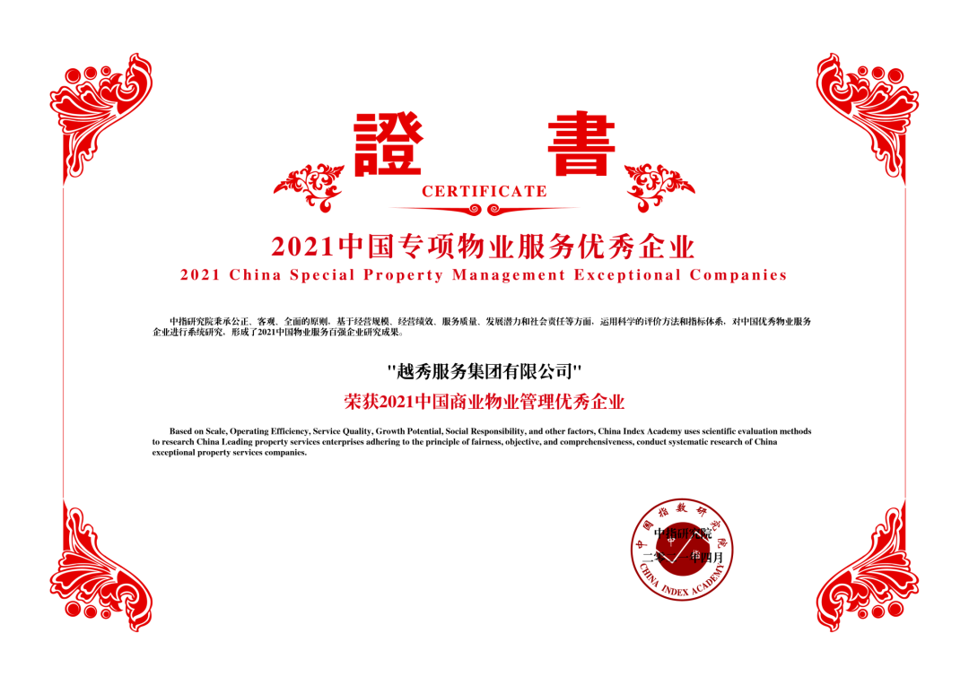 2021年4月22日,由中指研究院、中国房地产TOP10研究组主办的“2021中国物业服务百强企业研究成果发布会暨第十四届中国物业服务百强企业家峰会”于北京隆重举行。研究组以“高质量·创新发展”为主题,在总结以往研究经验的基础上,进一步完善方法体系,从管理规模、经营绩效、服务质量、发展潜力、社会责任等五个方面出发,更加全面、客观地评价企业综合实力。